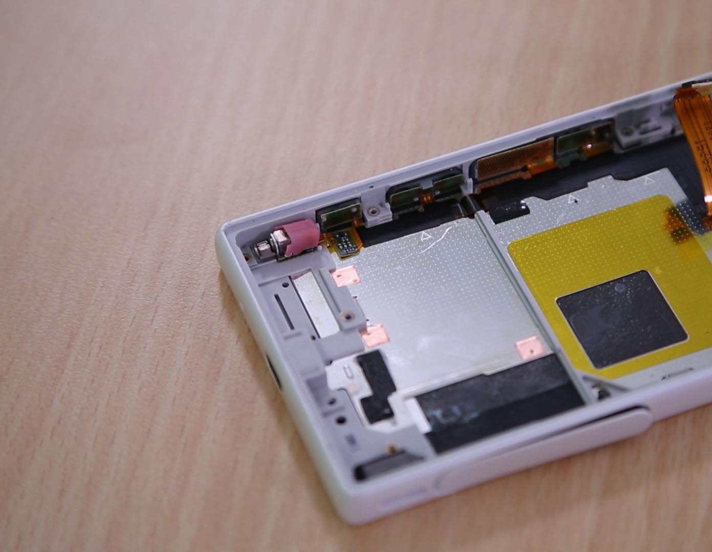 Als nächstes lösen Sie alle sichtbaren Steckverbindungen mit dem Spudger und nehmen nacheinander die Front- und Backkamera aus Ihrem Xperia Z5 Compact heraus. Danach entfernen Sie den Lautsprecher sowie die schmale Seitenschiene. Arbeiten Sie vorsichtig, um keines der Teile zu beschädigen.
