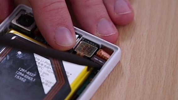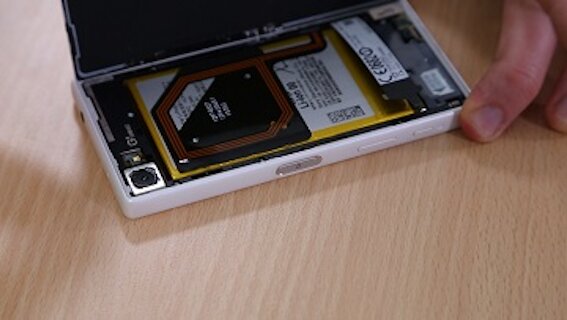 Nachdem alle Schrauben entfernt wurden, wird nun die Abdeckung gelöst, um an die darunterliegenden Teile zu gelangen. Entfernen Sie als erstes das untere, rechte Eckstück und lösen Sie anschließend die Steckverbindung der Induktionsspule, um danach den NFC-Chip zu entfernen. Nehmen Sie die gesamte Abdeckung ab.