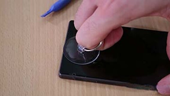 Nun kann das Display abgenommen werden. Gehen Sie hierfür mit einem Spatel zwischen Display und Rahmen. Fahren Sie einmal um das Display herum. Anschließend können Sie das Display mithilfe eines Saugnapfes abheben und beiseite legen. Sollte es sich nicht lösen lassen, legen Sie noch einmal die erhitzten Gelkissen darauf. Nun wird das neue Display auf das Sony Xperia Z5 gesetzt.