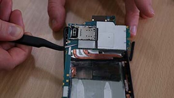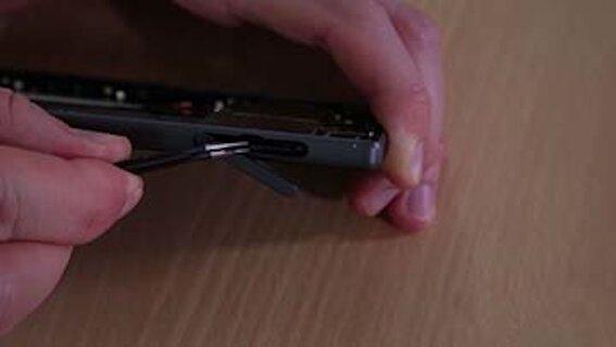 Spätestens jetzt müssen Sie den SIM-Schlitten herausnehmen. Öffnen Sie hierfür die Abdeckung vor dem SIM-Slot. Anschließend können Sie den SIM-Schlitten mit den Fingern oder mithilfe einer Pinzette herausnehmen. Dieser Schritt ist notwendig, um später das Motherboard ausbauen zu können.