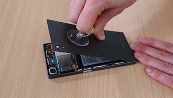 Nun können Sie versuchen, das Backcover abzunehmen. Nutzen Sie hierfür zunächst einen Spatel, mit dem Sie vorsichtig einmal um die Rückwand fahren. Anschließend können Sie das Backcover mithilfe eines Saugnapfes abheben. Sollte sich die Rückwand noch nicht lösen lassen, müssen Sie die Gelkissen noch etwas länger auf dem Handy liegen lassen und eventuell nochmal aufwärmen.