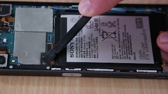 Haben Sie den Akku entnommen, müssen Sie rechts neben der Stelle, wo das Flexkabel des Akkus verbunden war, ein weiteres Flexkabel mit dem Spudger lösen. Fahren Sie am linken Rand des Sony Xperia Z5 mit dem Spudger entlang und lockern Sie den Lautsprecher, der an dem Flexkabel hängt. Entfernen Sie ihn mit der Pinzette.