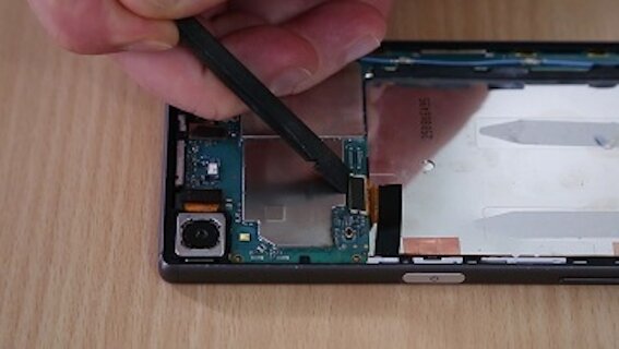 Jetzt haben Sie bereits den Akku, die Kameras und den Lautsprecher entnommen, nun müssen Sie auch das Motherboard für die Reparatur entfernen. Andersfalls gelangen Sie nicht an die defekte Kopfhörerbuchse. Das Motherboard sollte sich mit der Pinzette abheben und komplett aus Ihrem Sony Xperia Z5 entfernen lassen.
