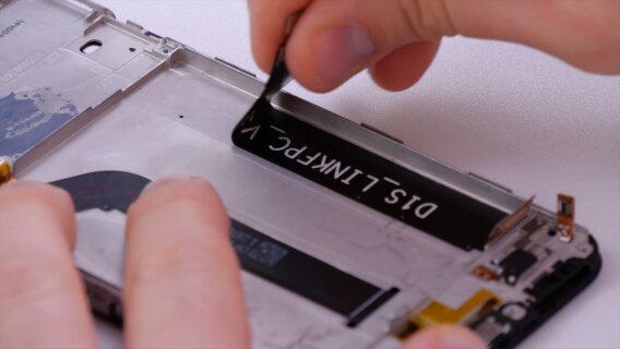 Bevor Sie das Gehäuse komplett vom restlichen Teil des Handys lösen können, müssen Sie das Flexkabel an der Steckverbindung lösen, welches den Fingerabdrucksensor mit der Platine verbindet. Nehmen Sie dazu einfach den Spachtel und lösen Sie ganz vorsichtig die Steckverbindung. Nun können Sie das Gehäuse vollständig abnehmen.