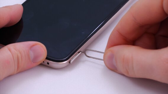 Nun müssen Sie den SIM-Slot aus dem Gehäuse entfernen, damit Sie im Anschluss problemlos das Gerät öffnen können. Nehmen Sie dazu den SIM-Pin und drücken Sie damit in das kleine Loch an der Seite des Gehäuses. Nun schiebt sich der SIM-Slot ein kleines Stück heraus. Im Anschluss können Sie den SIM-Schlitten problemlos rausziehen.