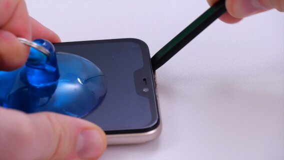 Nehmen Sie nun den Saugnapf und platziere Sie ihn auf dem Display Ihres Xiaomi Mi A2 Lite. Wenn Sie nun an dem Saugnapf ziehen, sollte sich nach einiger Zeit ein kleiner Spalt auftun, in den Sie den Spachtel stecken können. Um an diesen Punkt zu gelangen, brauchen Sie etwas Geduld. Anschließend können Sie nach und nach das Gehäuse mit dem Spachtel lösen.