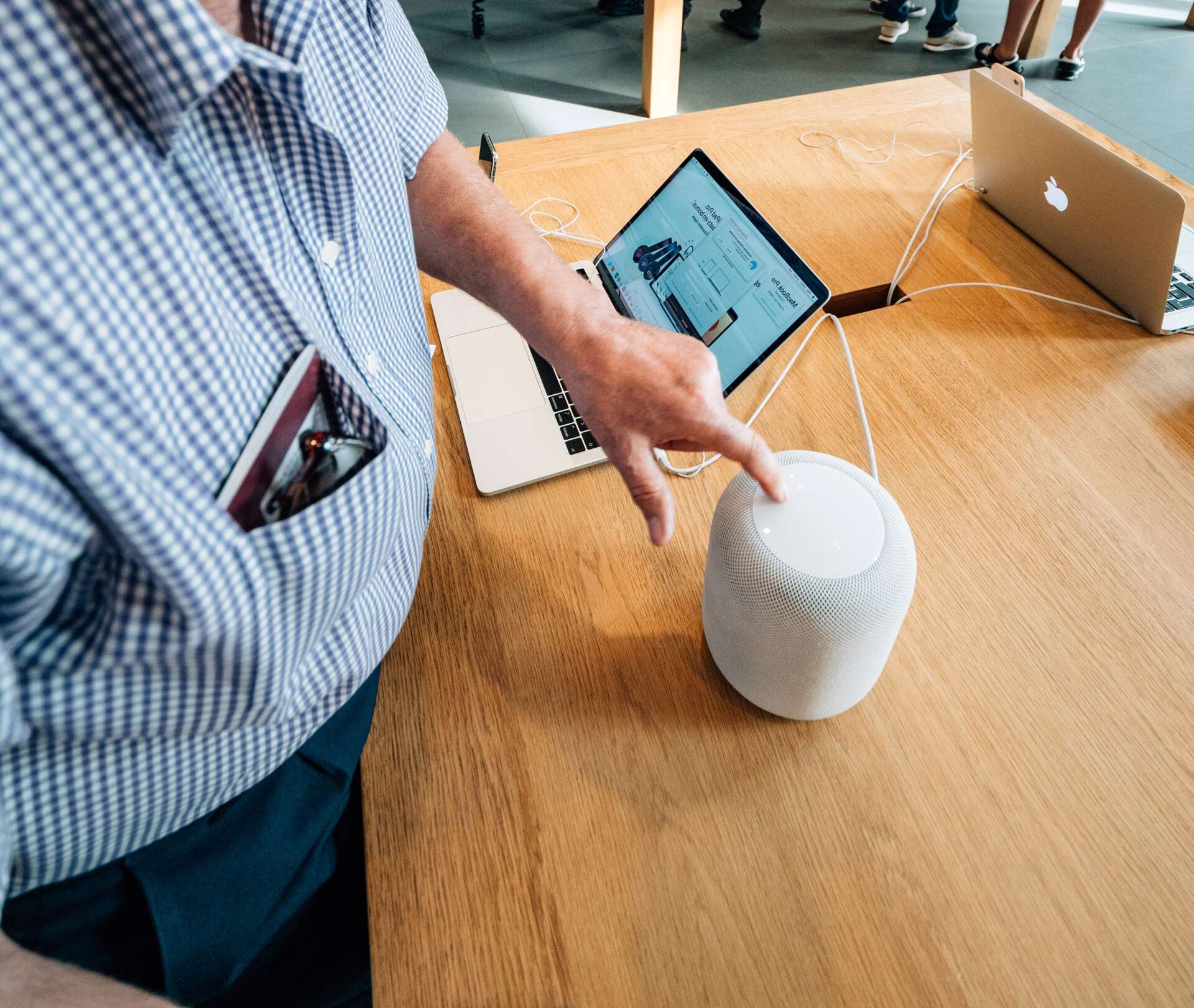 Damit der HomePod funktioniert, müssen Sie diesen zunächst mit Ihrem iPhone verbinden. Das geht glücklicherweise recht unkompliziert. Nachdem Sie den Lautsprecher an eine Steckdose angeschlossen haben, kann es losgehen. Halten Sie Ihr Gerät einfach in die Nähe des HomePods, auf diese Weise kann er sich mit dem iPhone verbinden. Ein entsprechendes Pop-Up Fenster auf Ihrem Handydisplay manövriert Sie durch den Installationsprozess. Dazu zählt, dass sich der Lautsprecher mit Ihrem Apple-Account sowie mit Ihrem WLAN-Netzwerk synchronisieren muss. Nach ein paar Schritten ist die iPhone-Verbindung hergestellt und Sie können den HomePod verwenden.