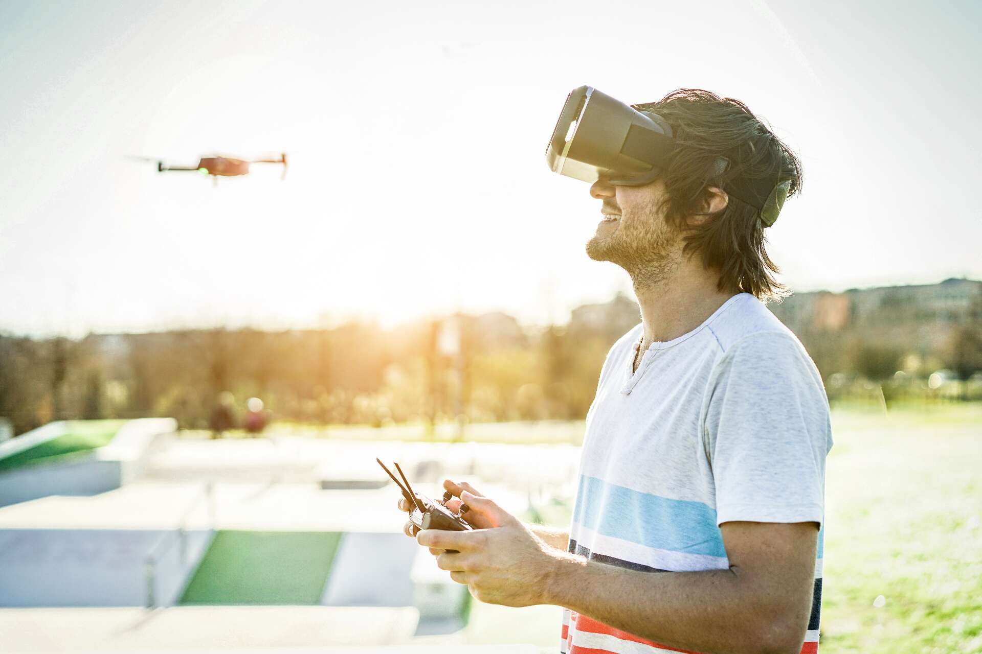 So könnte es bei einer Rennveranstaltung der neueren Art zugehen: dem Drohnen- oder FPV-Racing. FPV steht für First Person View, also die Sicht aus der „Ich-Perspektive“. Die Modellflugpiloten erleben das Rennen Dank Virtual Reality-Brille aus der Perspektive ihrer mit Kamera ausgestatteten Drohne.