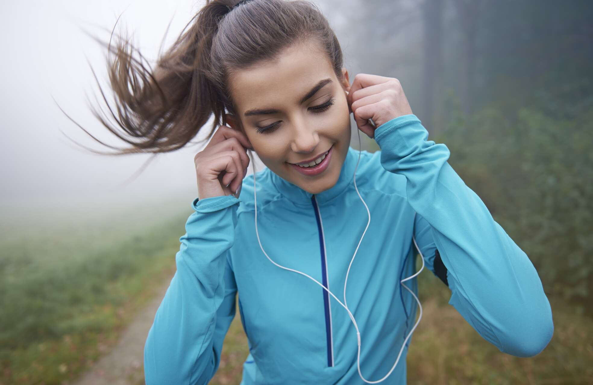 Frau in Sportklamotten hält ihre InEar-Kopfhörer fest.